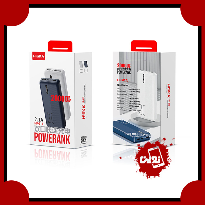 پاوربانک هیسکا مدل HP-213 یک شارژر همراه با ظرفیت 20000 میلی آمپر ساعت است که می تواند با یکبار شارژ کامل موبایل و تبلت های شمارو سه الی چهار بار کامل شارژ کند.طراحی ساده، اندازه کوچک و ظریف این سری از پاوربانک‌­های هیسکا از ویژگی­‌های قابل‌توجه آن به شمار می‌­آید. جنس بدنه ترکیبی از پلاستیک فشرده و پلی‌کربنات نسوز با ضخامت کم میباشد. این ویژگی باعث شده وزن پاوربانک سبک و به‌راحتی قابل‌حمل باشد. همچنین پاور بانک حاوی 4 عدد چراغ LED در قسمت پورت محصول است که میزان شارژ هر پورت را نمایش می‌­دهد. این پاوربانک دارای دو پورت USB-A، یک پورت TYPE-C و یک پورت MICRO میباشد.