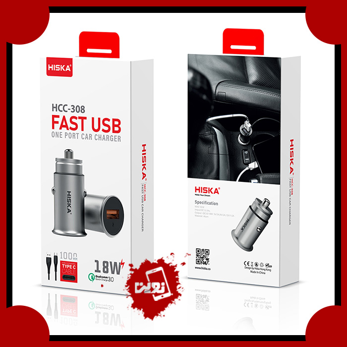 شارژر فندکی مدل HCC-308 یک شارژر با کیفیت که توسط شرکت HISKA ساخته شده است. شارژرهای فندکی یک راه رایج برای جلوگیری از تمام شدن شارژ باتری گجت‌های هوشمند شما در طول روز و ساعاتی که به پریز برق دسترسی ندارید، محسوب می‌شوند. شما با استفاده از یک شارژر فندکی می‌توانید باتری گوشی‌های موبایل، دوربین دیجیتال، موزیک پلیر و دیگر دستگاه‌های از این قبیل خود را داخل خودرو، بدون نیاز به استفاده از پریز برق، شارژ کنید. وی سطح این شارژر 1 درگاه خروجی USB تعبیه شده که شدت‌جریان خروجی آن 3 امپر است. ولتاز خروجی پورت این دستگاه برابر DC 5V~3A/ 9V~2.22A/ 12V~2.5A میباشد. توان خروجی کل این شارژر 18 وات بوده و میتواند ابزار دیجیتالی شما را به صورت سریع شارژکنند. این محصول با توجه به مجهز بودن به استانداردهای QC می‌تواند انواع گوشی‌های موبایل و تبلت را هم به‌راحتی شارژ کند.